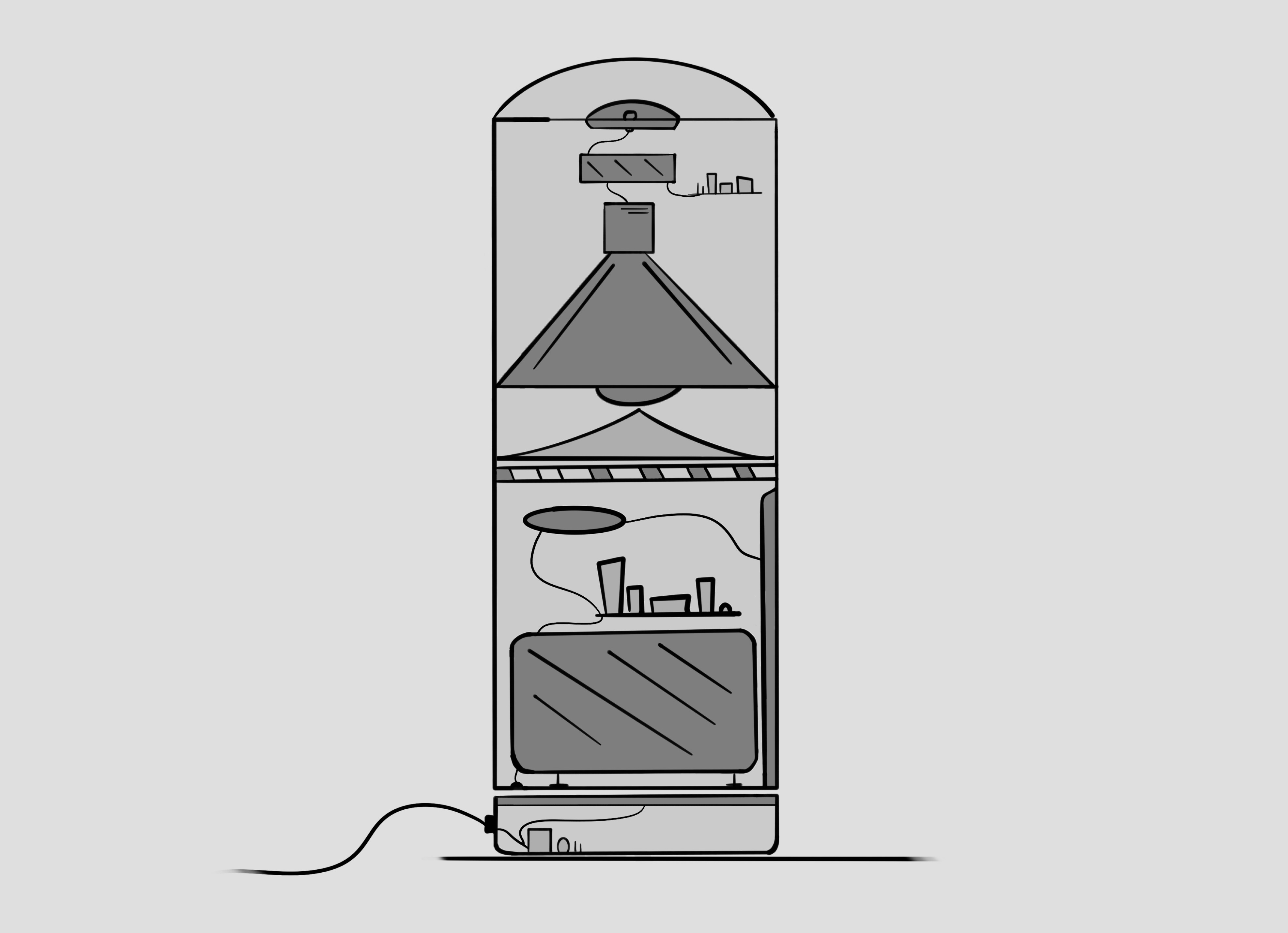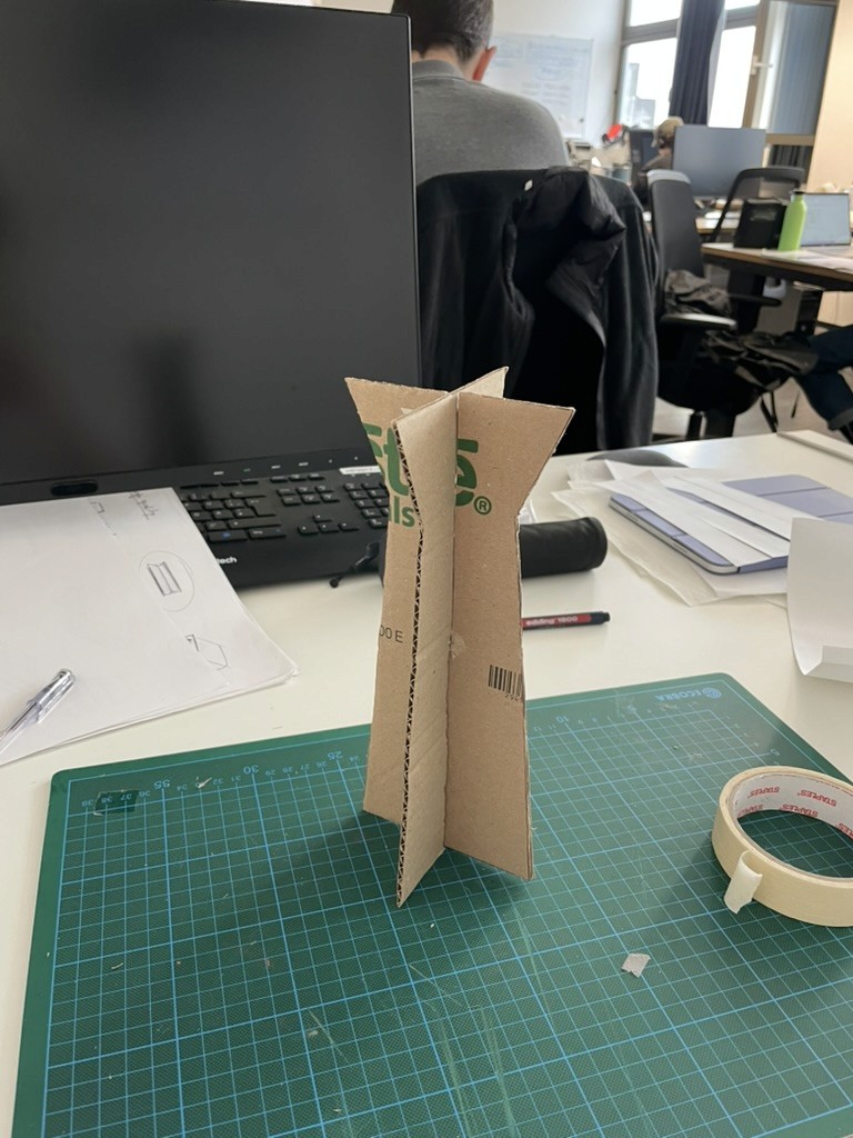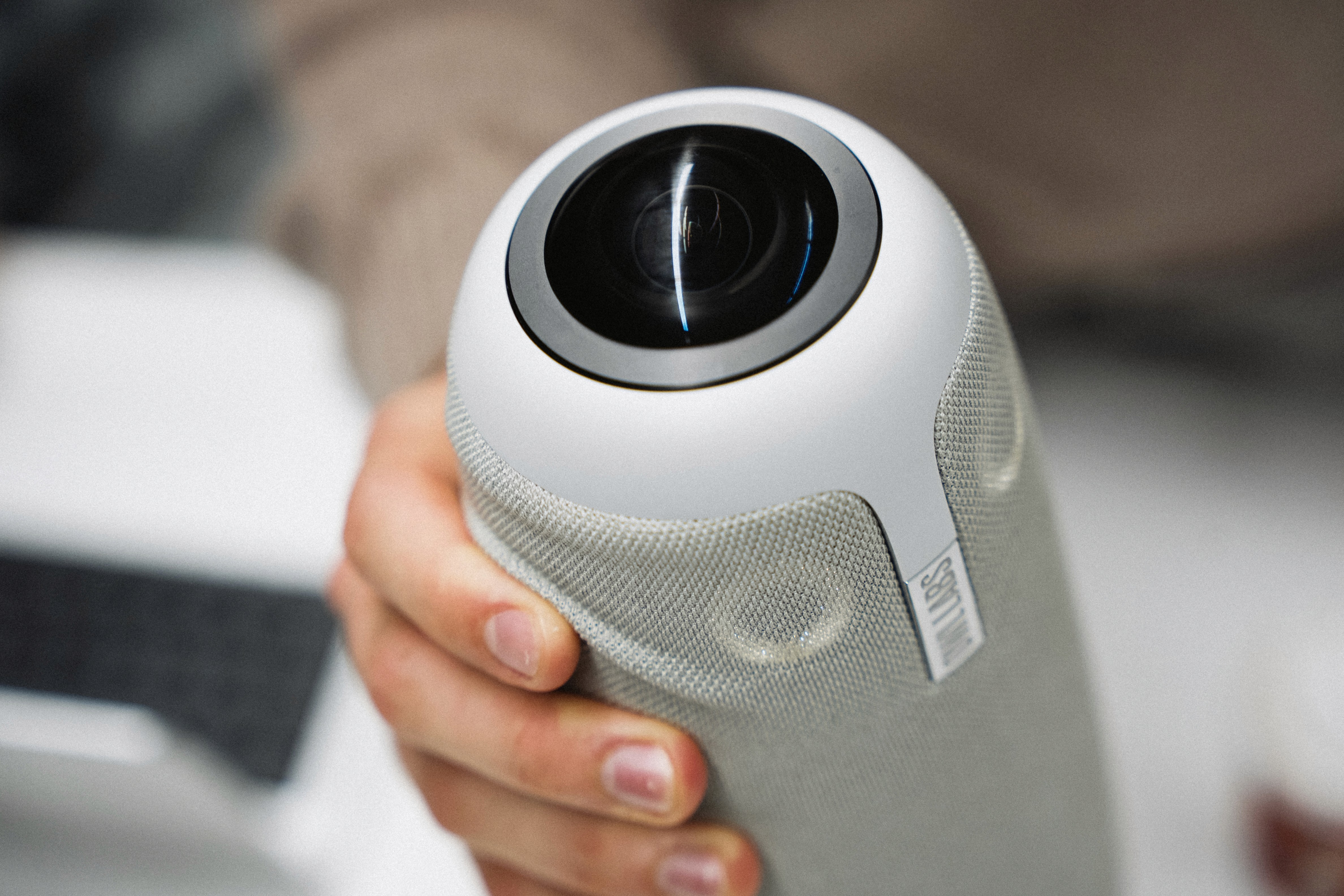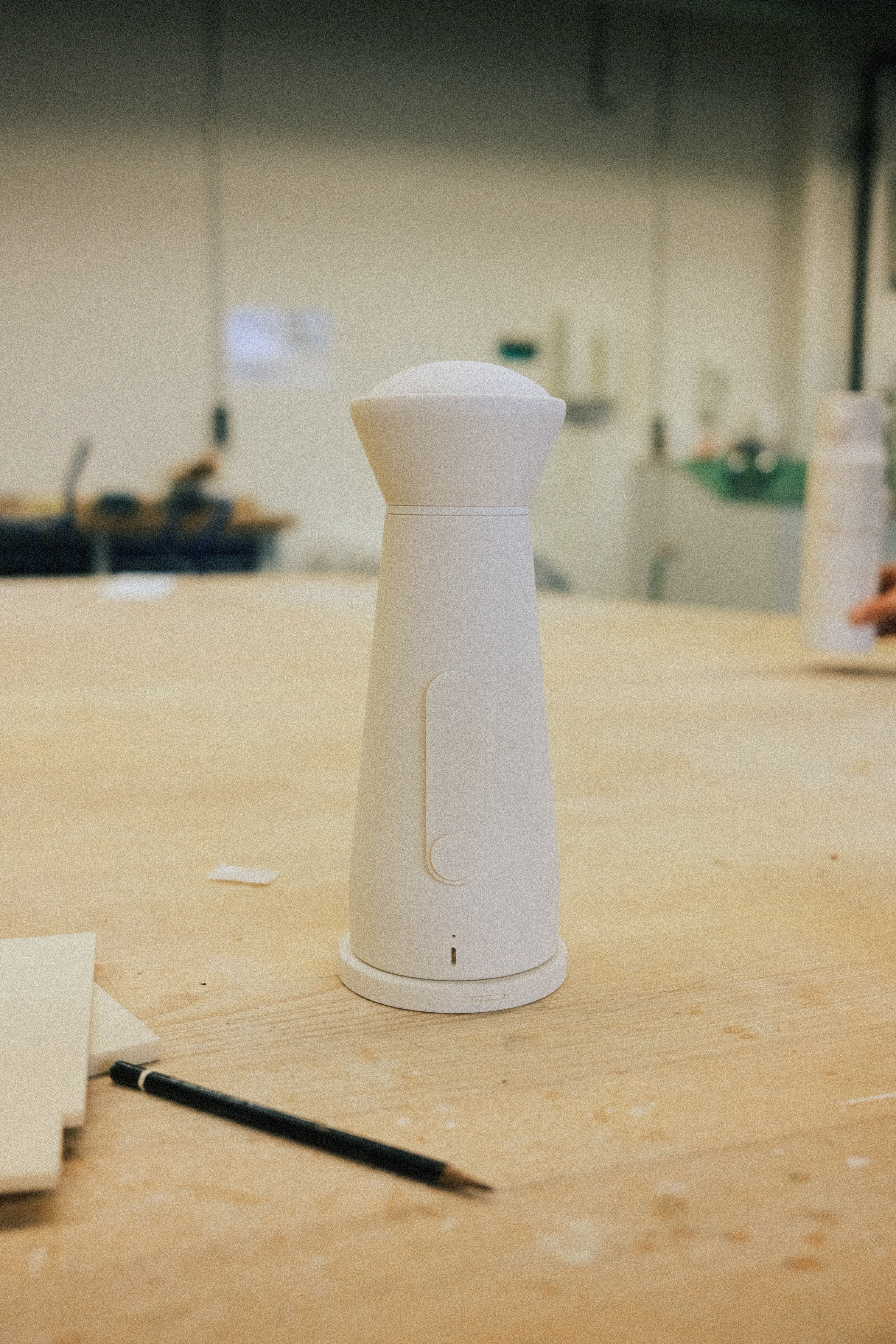 During the design process, the shape was developed using sketches, cardboard models, and 3D-printed prototypes, and optimized through various adjustments. The resulting basic volume consists of two opposing cylinders that enable ergonomic handling. The design follows a clear design language and supports intuitive operation. The size was dimensioned so that the system protrudes above conventional laptops and ensures optimal capture of participants by the camera.