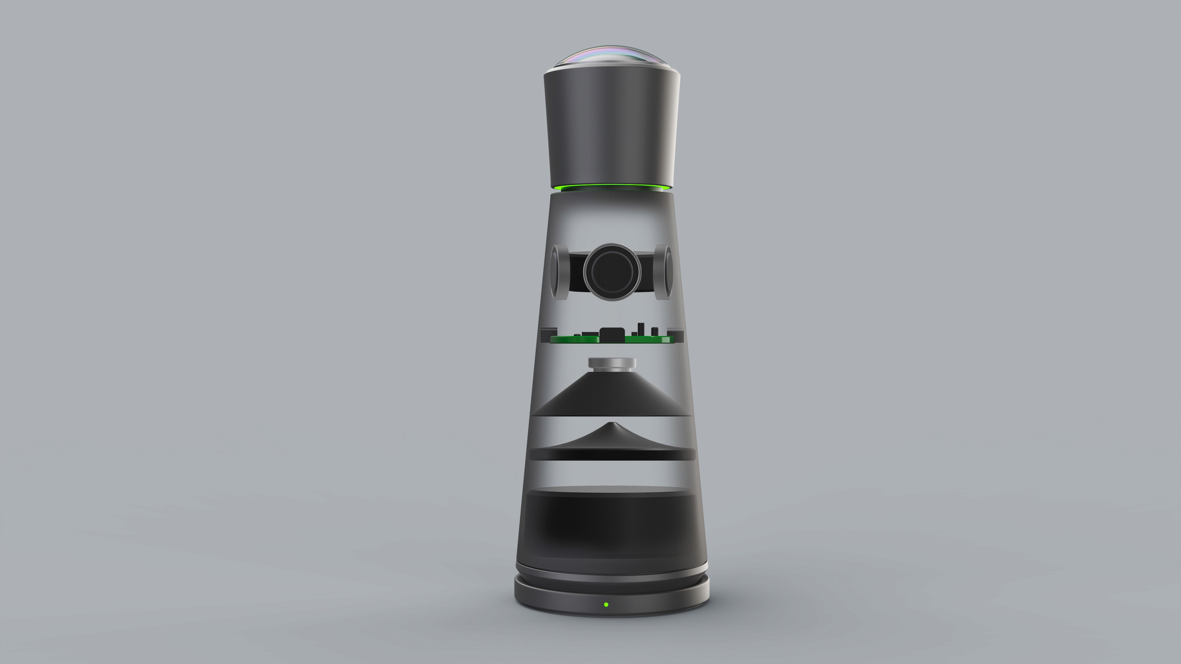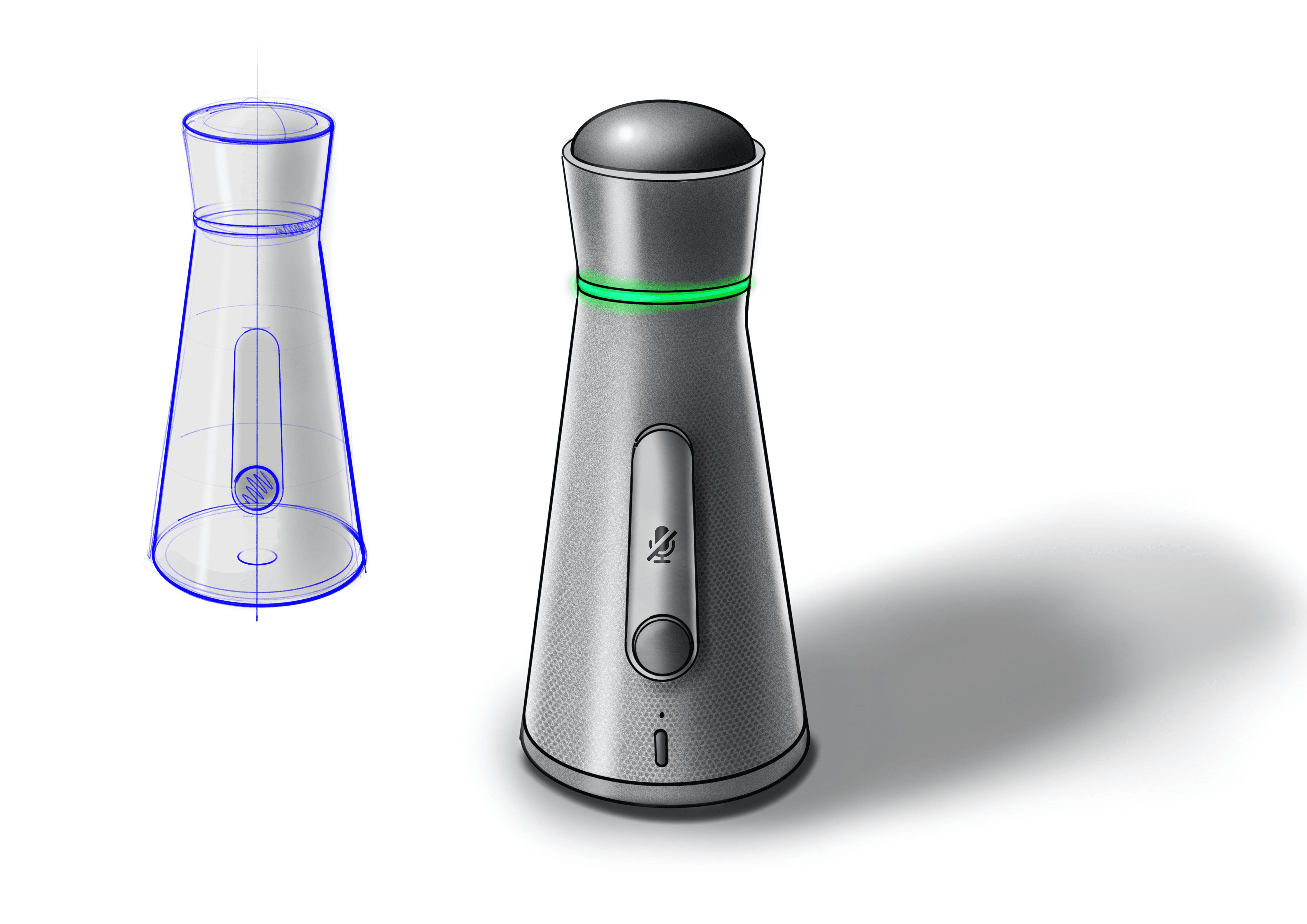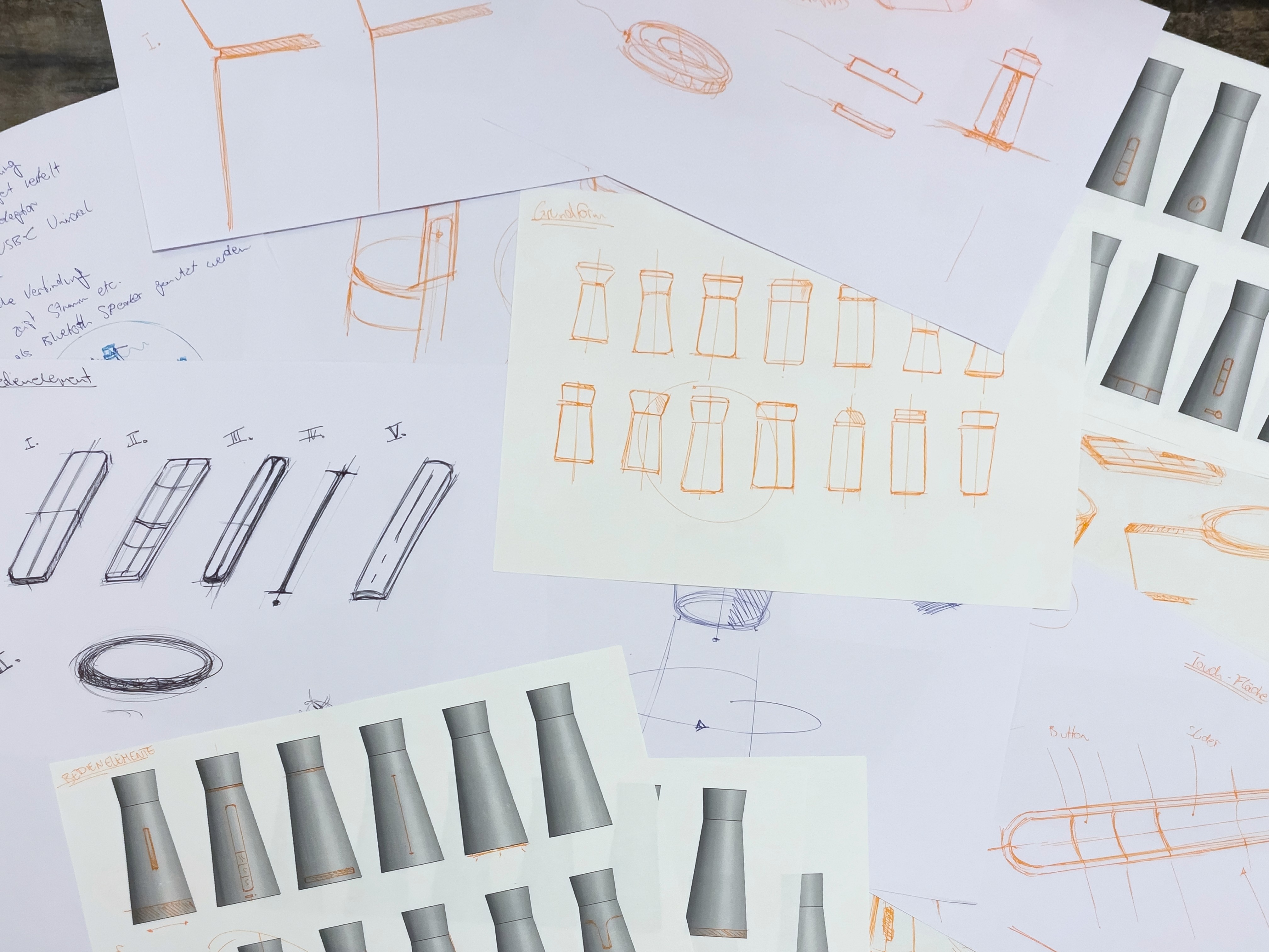 The system features a compact design, a 360° camera, and an omnidirectional microphone with adjustable quality. Calendar entries and apps are integrated, while haptic and acoustic feedback supports operation. Customizable buttons and special functions enable flexible use. The technical design of the device is based on several technical components. It features an integrated woofer, tweeter, 360° camera, circuit boards, and a large battery to ensure long runtime. The initial design drawings and form studies served to explore basic proportions and design approaches. Variants were examined in terms of ergonomics and technical integration. The final design was chosen based on this.