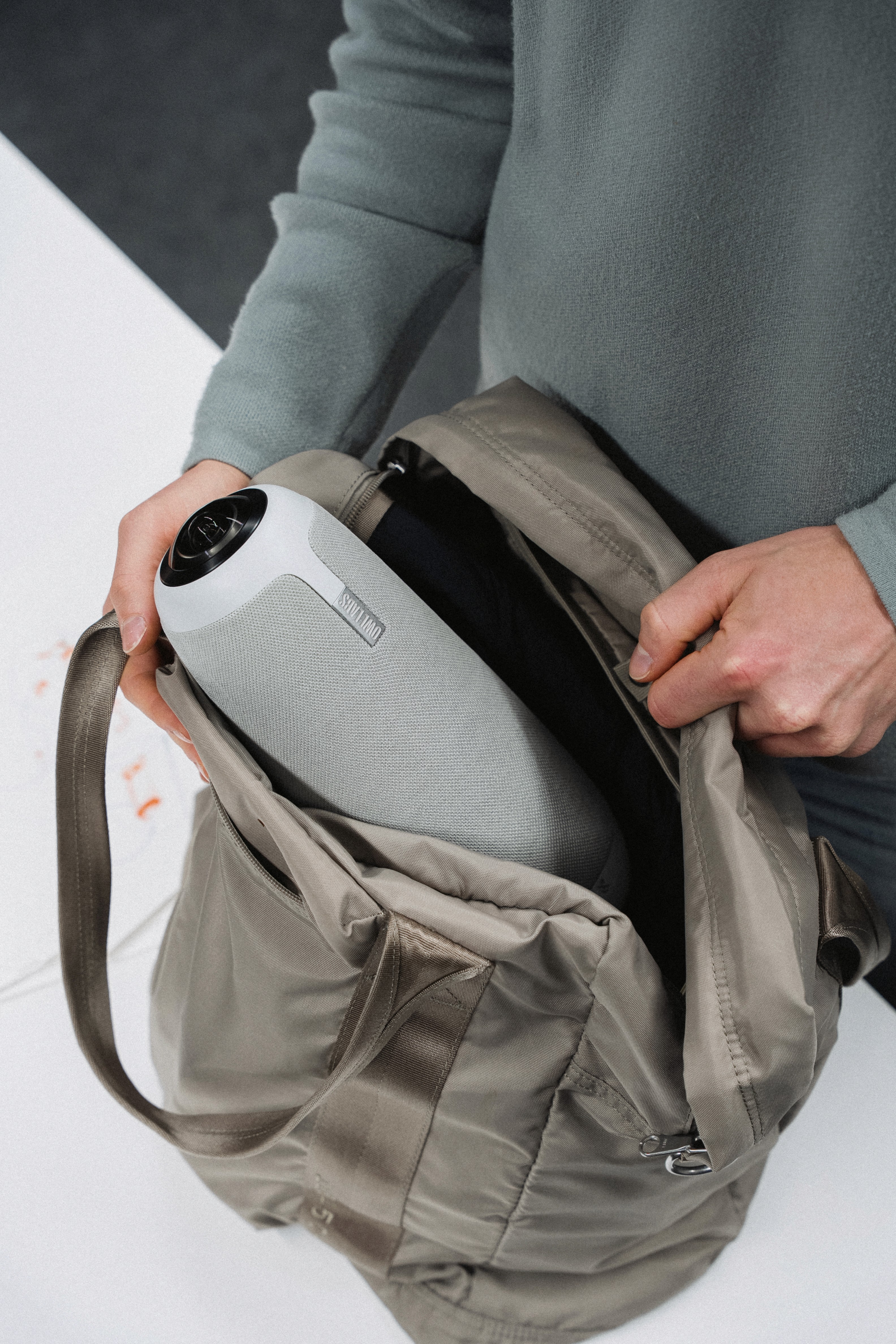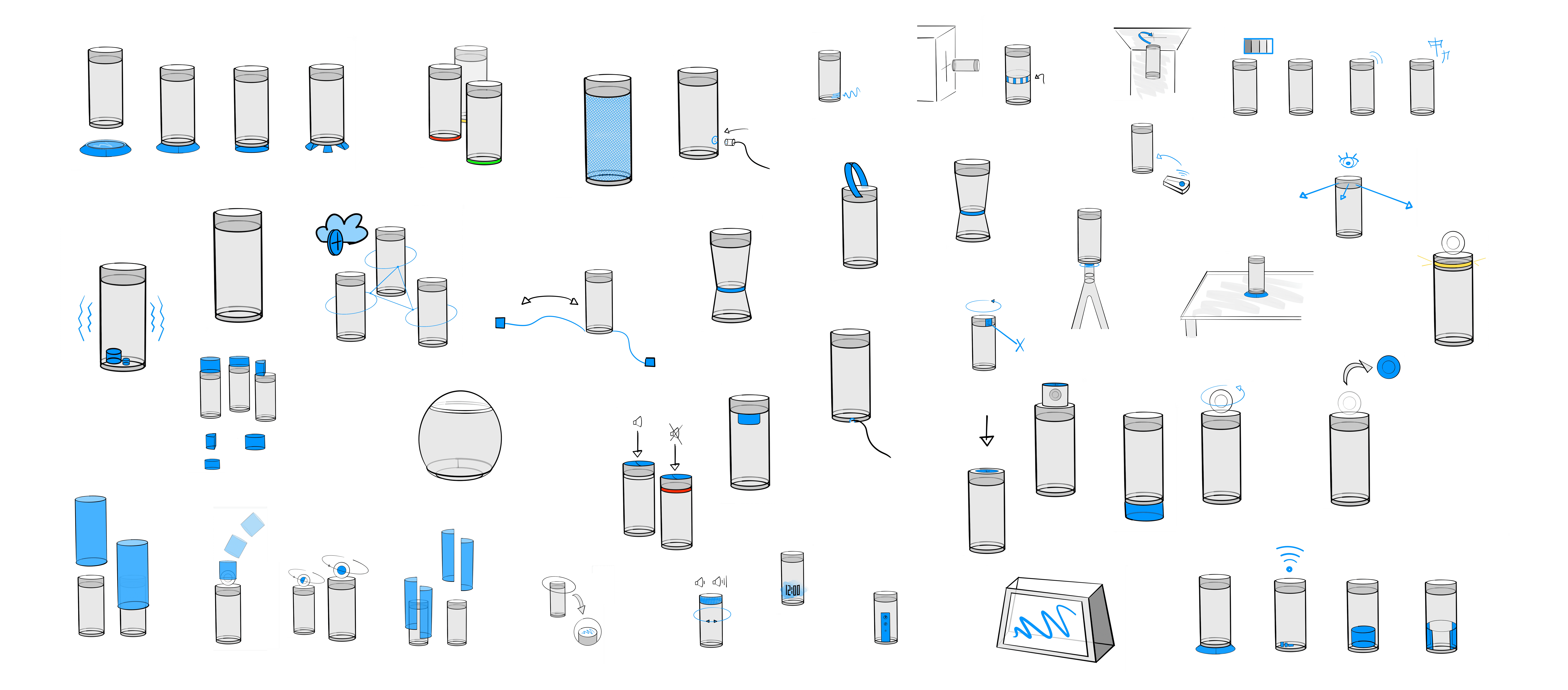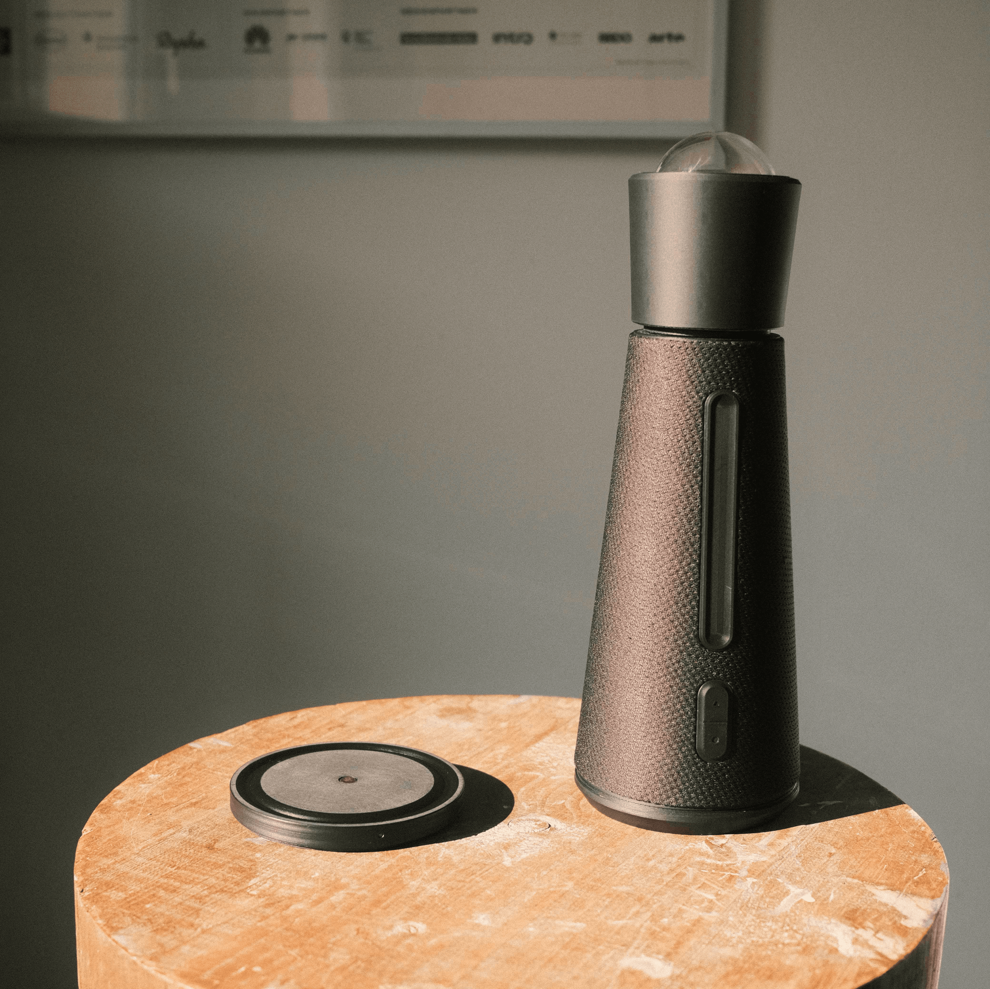 The system features a compact design, a 360° camera, and an omnidirectional microphone with adjustable quality. Calendar entries and apps are integrated, while haptic and acoustic feedback supports operation. Customizable buttons and special functions enable flexible use. The technical design of the device is based on several technical components. It features an integrated woofer, tweeter, 360° camera, circuit boards, and a large battery to ensure long runtime. The initial design drawings and form studies served to explore basic proportions and design approaches. Variants were examined in terms of ergonomics and technical integration. The final design was chosen based on this.
